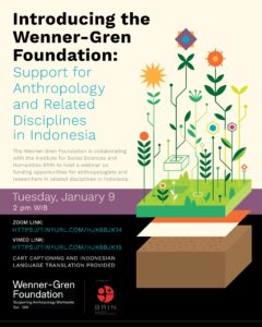 The Wenner-Gren Foundation is collaborating with the Institute for Social Sciences and Humanities BRIN to host a webinar on funding opportunities for anthropologists and researchers in related disciplines in Indonesia. Join Danilyn Rutherford, the Foundation’s President for a discussion of the Wenner-Gren’s history, mission and programs supporting anthropology and anthropologically oriented scholars, worldwide. Wenner-Gren provides support for individual and collaborative research projects, including engaged projects benefiting marginalized and minoritized communities. We also provide funding for meetings and capacity building projects of various kinds. And we award fellowships to doctoral students from countries where advanced training in anthropology is less accessible, and to scholars bringing a writing or media project to completion. Danilyn will describe our grants and fellowships, offer some tips on applying for them, then open the floor for questions. If you are a doctorate in anthropology or a related field, or a doctoral student pursuing your degree, Wenner-Gren can be a great source of support.